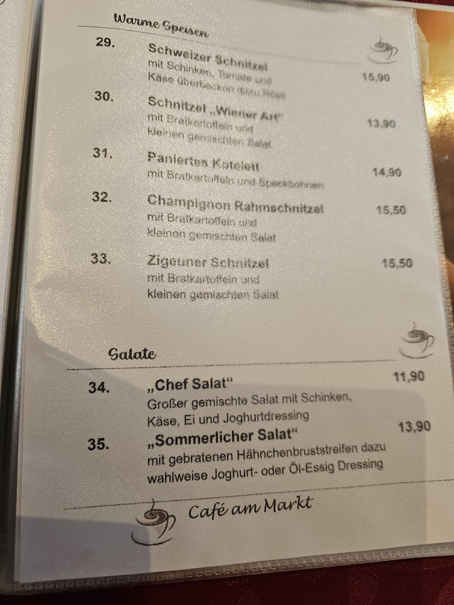 The menu at Café am Markt Hohenlimburg offers a variety of options suitable for breakfast, coffee breaks, and light meals. Patrons can choose from a selection of fresh bakery items, including several cakes such as Carrot Cake, Käsekuchen, and Schokoladensahne-torte, which are frequently mentioned by visitors.